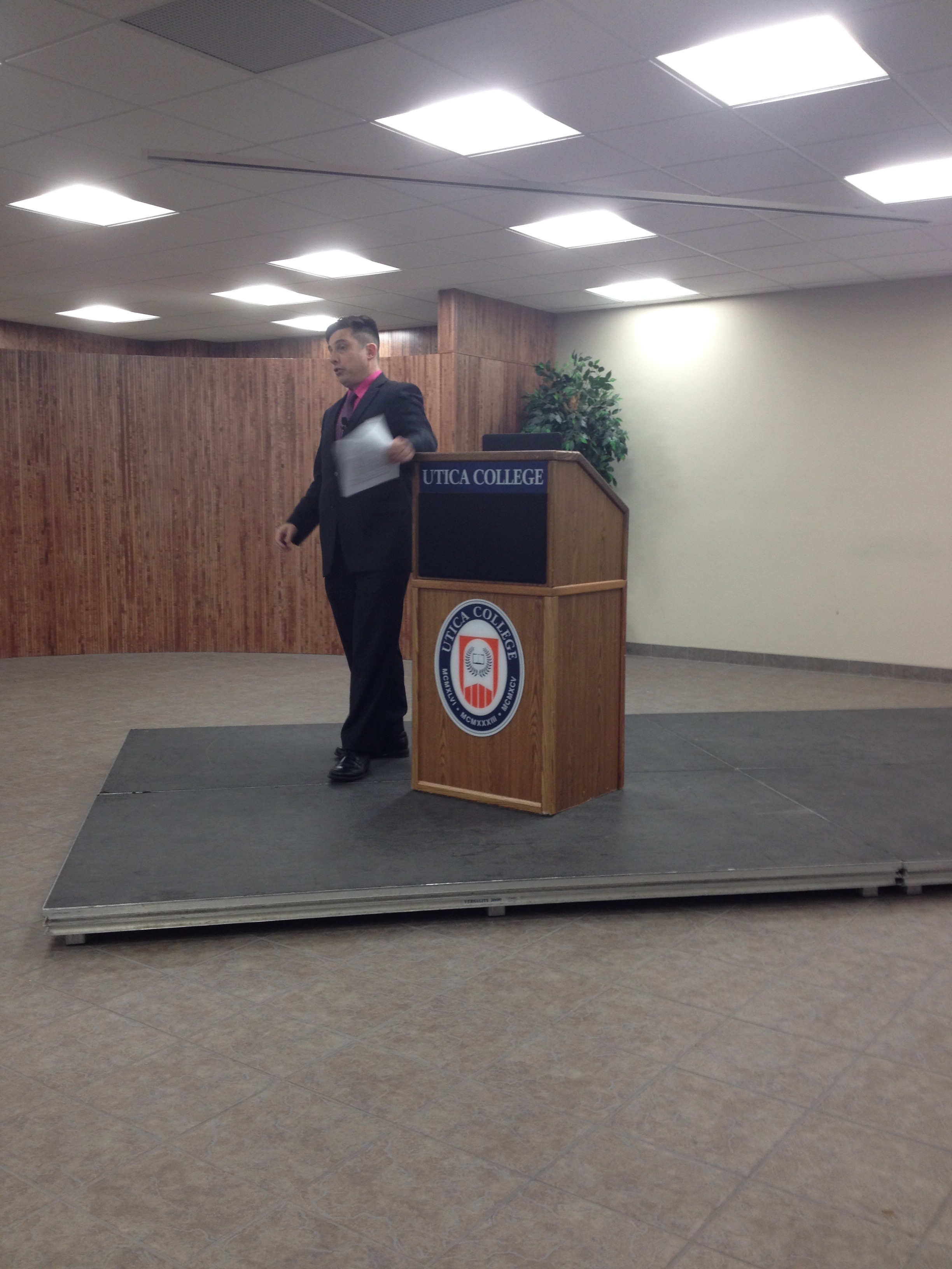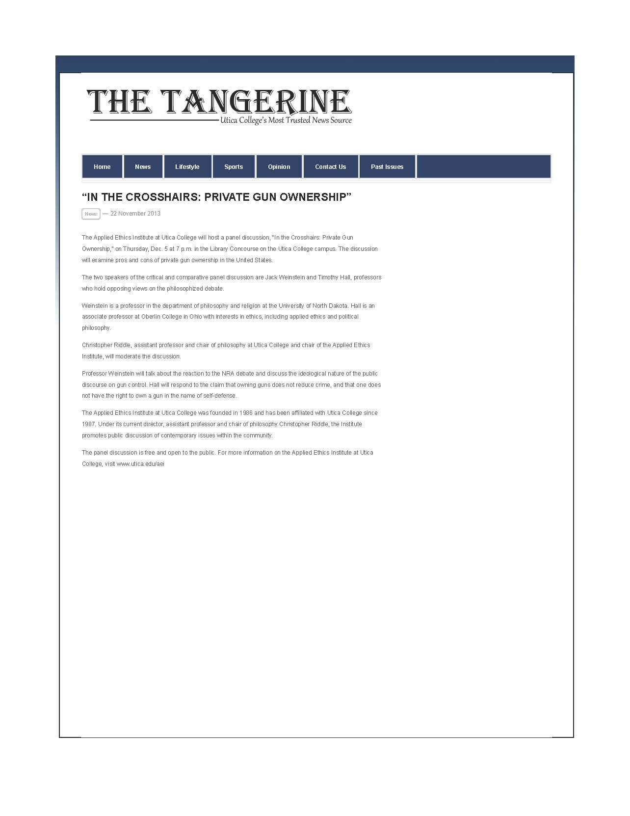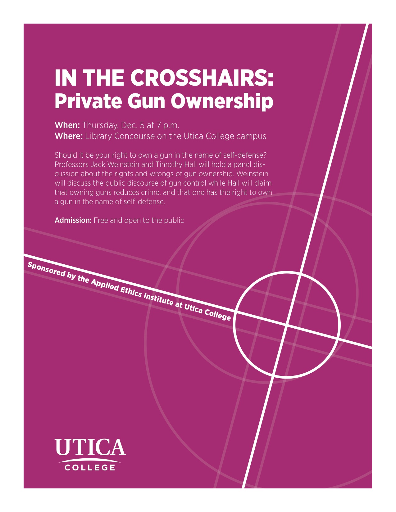 At 7:00 pm on Thursday, December 5, 2013, Professor Timothy Hall, Associate Professor of Philosophy, Oberlin College gave a public lecture titled "In The Crosshairs: Private Gun Ownership". The talk was hosted in the Library Concourse on Utica College's campus at 1600 Burrstone Rd., Utica, NY. Professor Jack Weinstein, Professor of Philosophy, University of North Dakota, was scheduled to attend but unfortunately had to cancel due to inclement weather.Hall's primary claim was that one has the right to own a gun in the name of self-defense.
